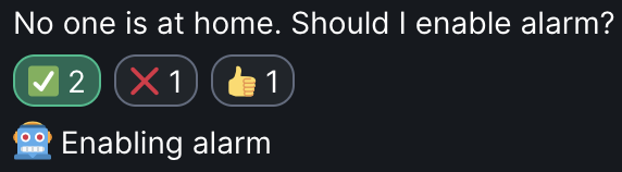 It's an Opsdroid bot, which reacts to a home-assistant entity state change (like person leaving a zone) and asks for confirmation in Matrix if it should run additional home-assistant automation. Matrix reactions are used for confirming or canceling an action.